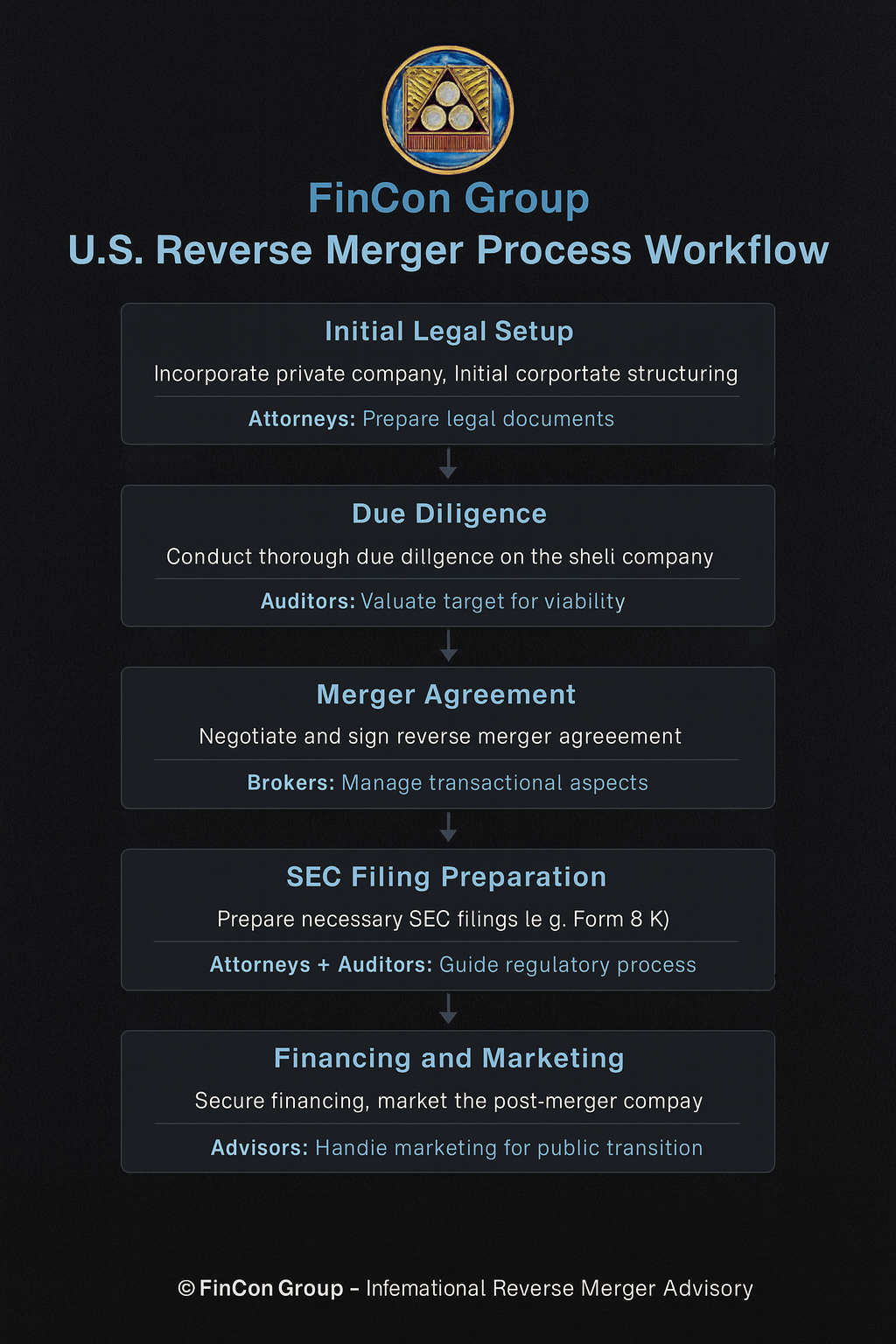 Determine best merger structure (share exchange, triangular merger, or direct takeover). Identify target exchange (OTCQB, NASDAQ, NYSE).